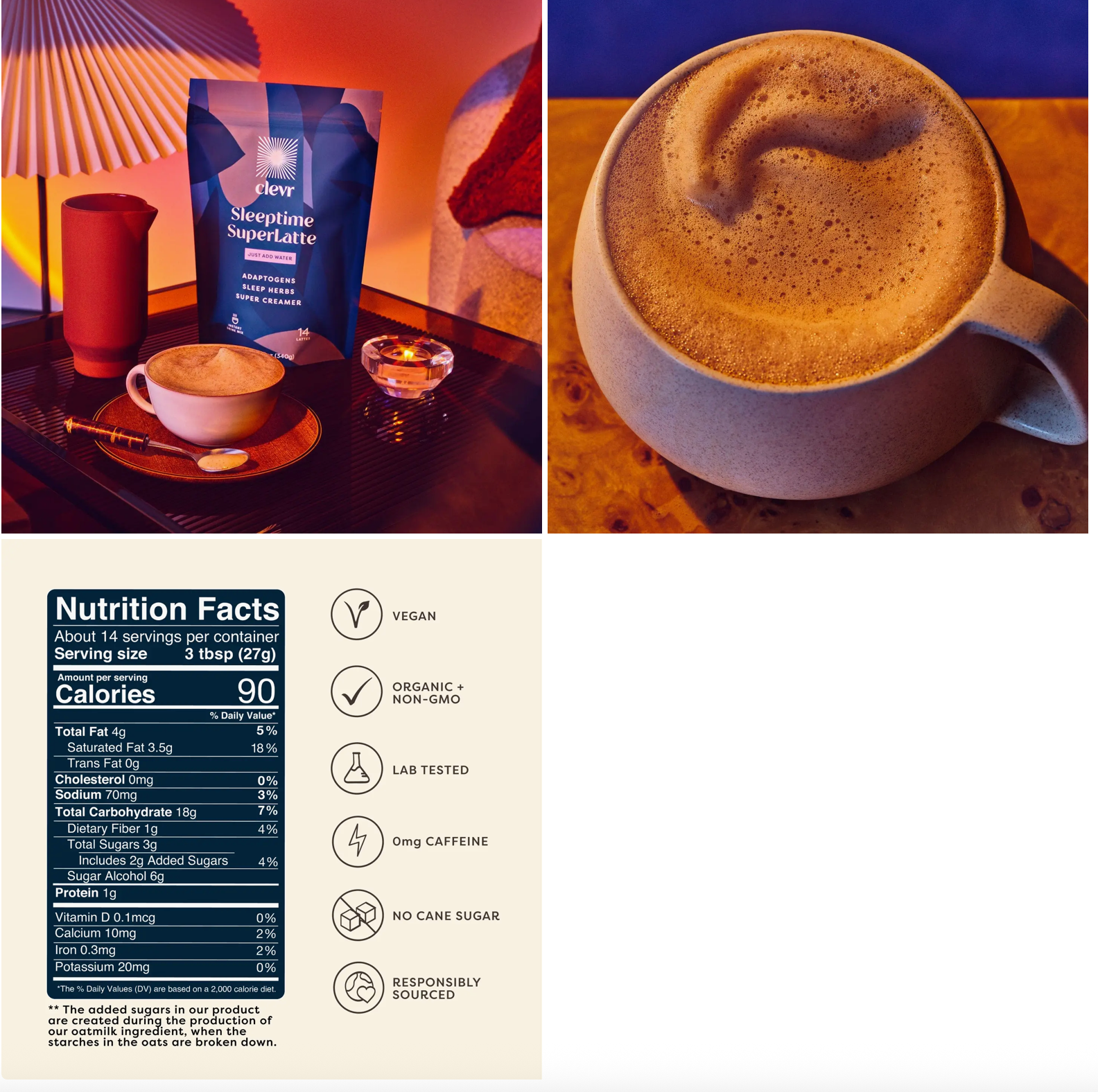 A caffeine-free nightcap infused with potent sleep-supporting botanicals that help quiet the mind, calm the body, and make it easier to fall — and stay — asleep. + Comforting Carob, Chicory, and Vanilla + Decadent oat milk & coconut cream + Adaptogens, sleep herbs & amino acids + Caffeine free (obviously) Tastes like a toasted cappuccino. Feels like sinking into a cloud. Actually works.